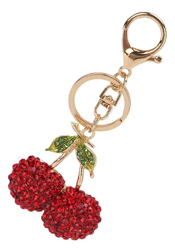Este llavero no es solo un accesorio: es una joya en miniatura. Las cerezas, cubiertas de cristales rojos facetados, capturan la luz con cada movimiento, mientras las hojas metálicas en verde tornasolado aportan un toque botánico chic.