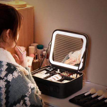 Eleva tu rutina de belleza a un nivel profesional en cualquier lugar. Este Maletín de Cosméticos no es solo una bolsa de almacenamiento; es una estación de maquillaje portátil que incorpora un Espejo HD con Luz LED para garantizar una aplicación impecable en cualquier condición de luz.